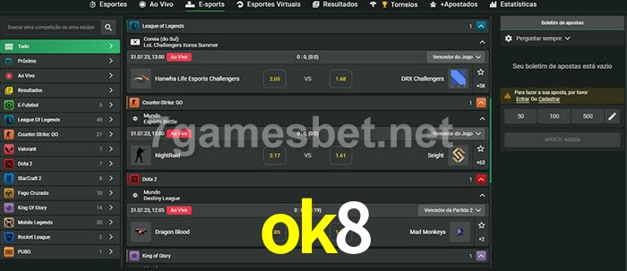 O ok8 oferece uma grande seleção de opções de apostas em e-sports com probabilidades competitivas